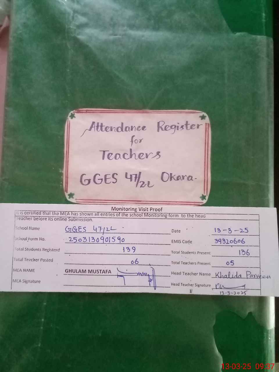 | Attendance Register | Head Teacher | MEA with School | Visit Proof |