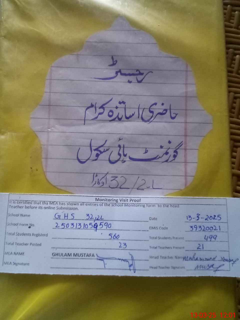 | EMIS Code: 39320021 | Name of School: GHS CHAK NO.32/2-L | |||