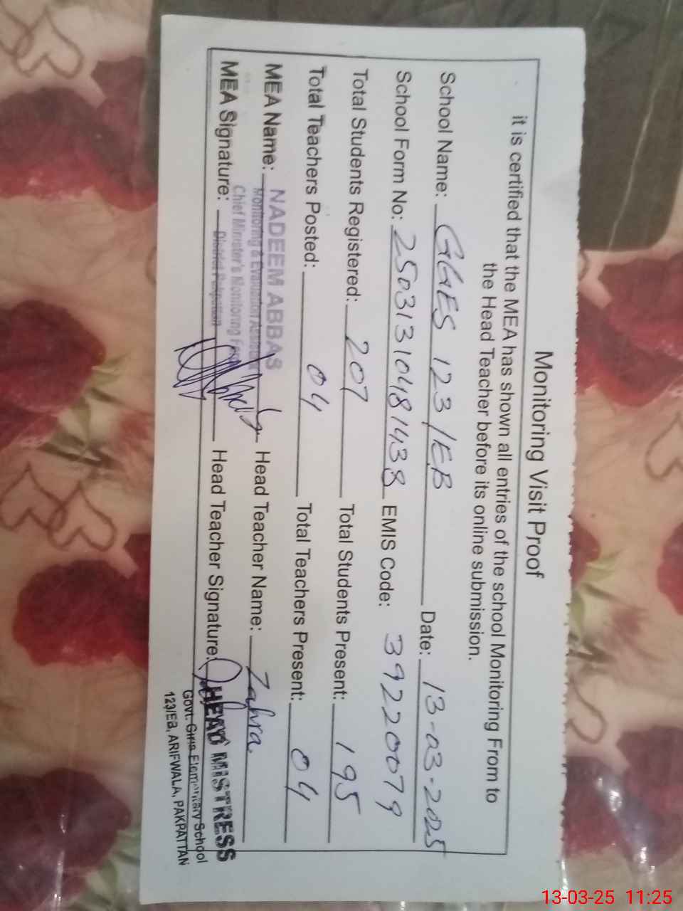 | Attendance Register | Head Teacher | MEA with School | Visit Proof |