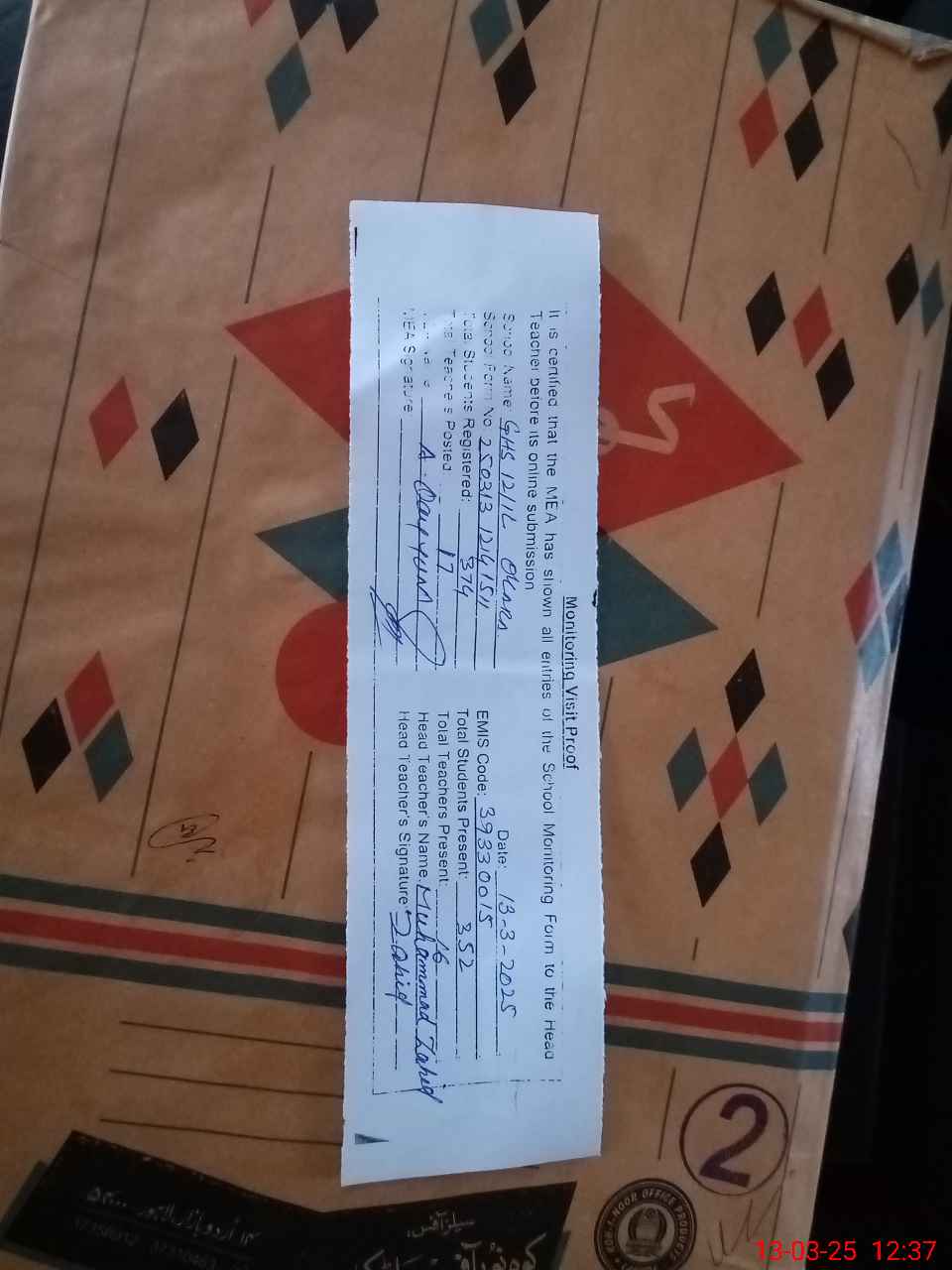 | Attendance Register | Head Teacher | MEA with School | Visit Proof |