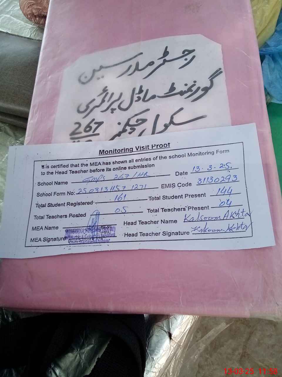 | EMIS Code: 31130293 | Name of School: GMPS CHAK NO 267 HR | |||