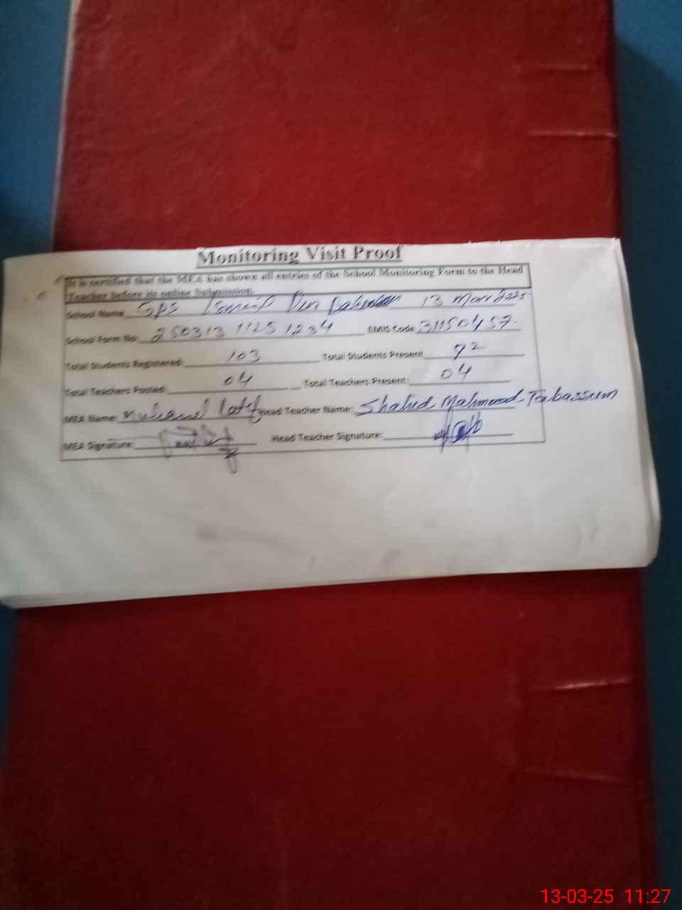 | Attendance Register | Head Teacher | MEA with School | Visit Proof |