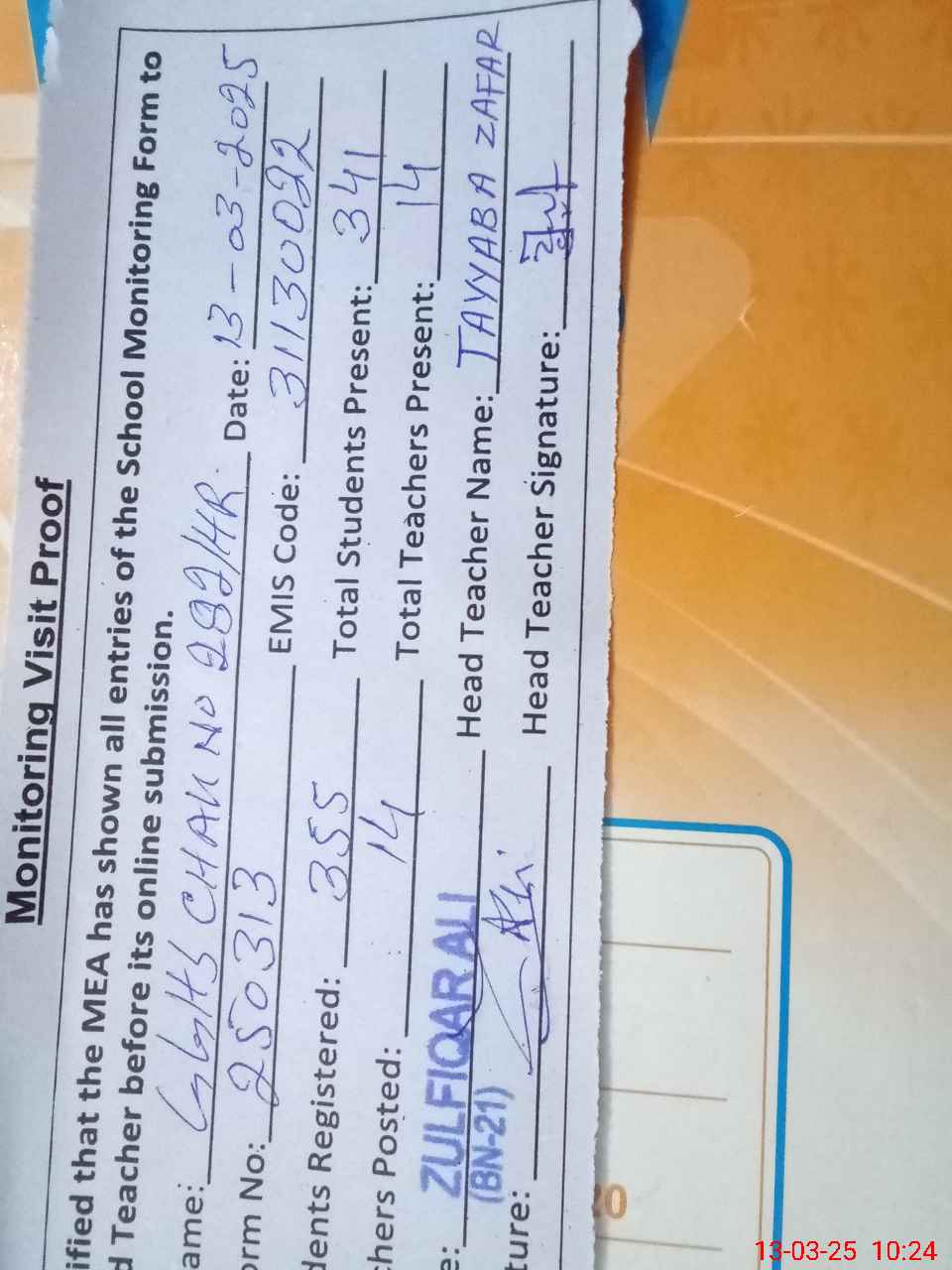 | Attendance Register | Head Teacher | MEA with School | Visit Proof |