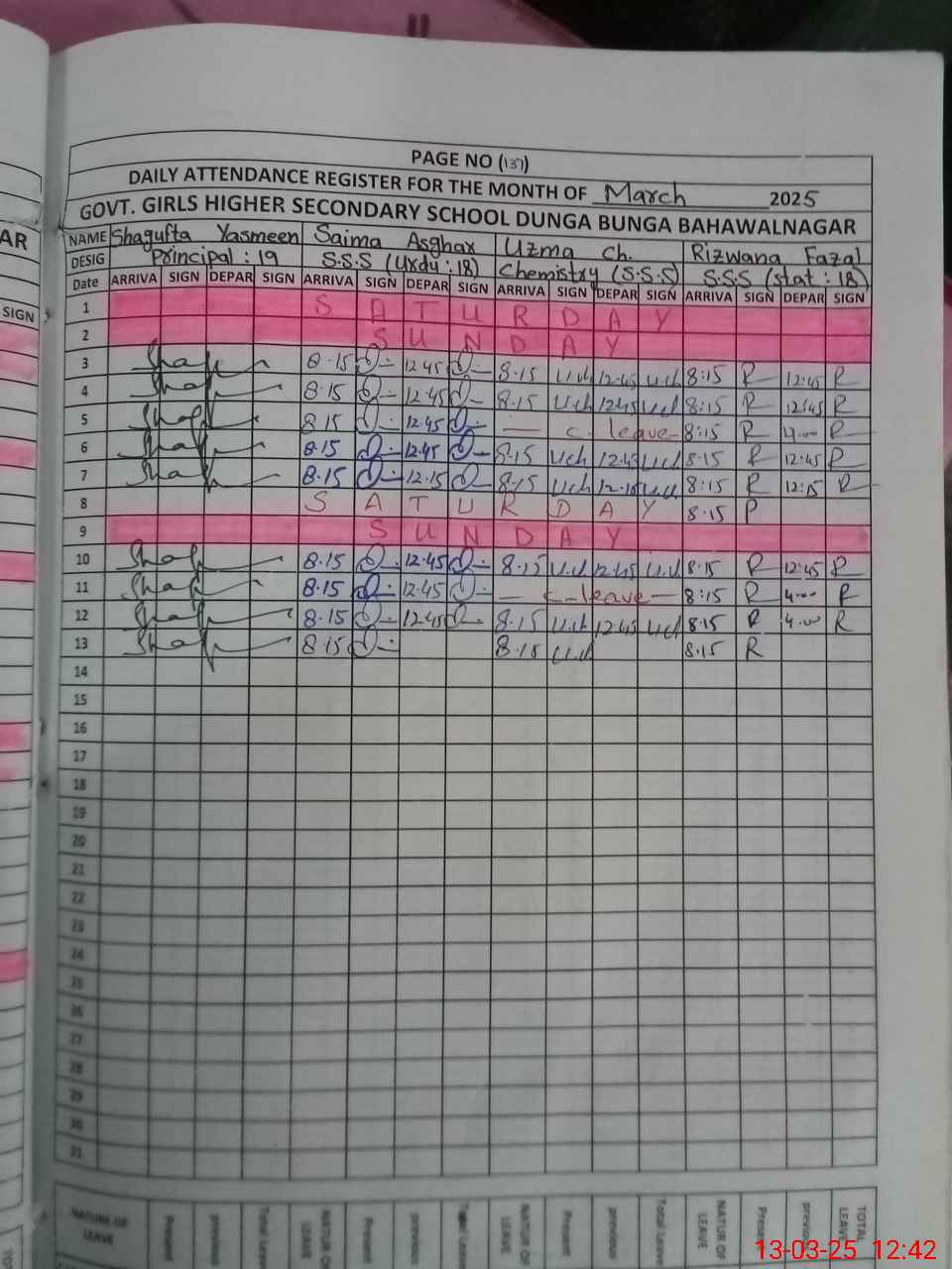 | CNIC | Full Name | Designation | R/C | Absence During Last Calender Month |