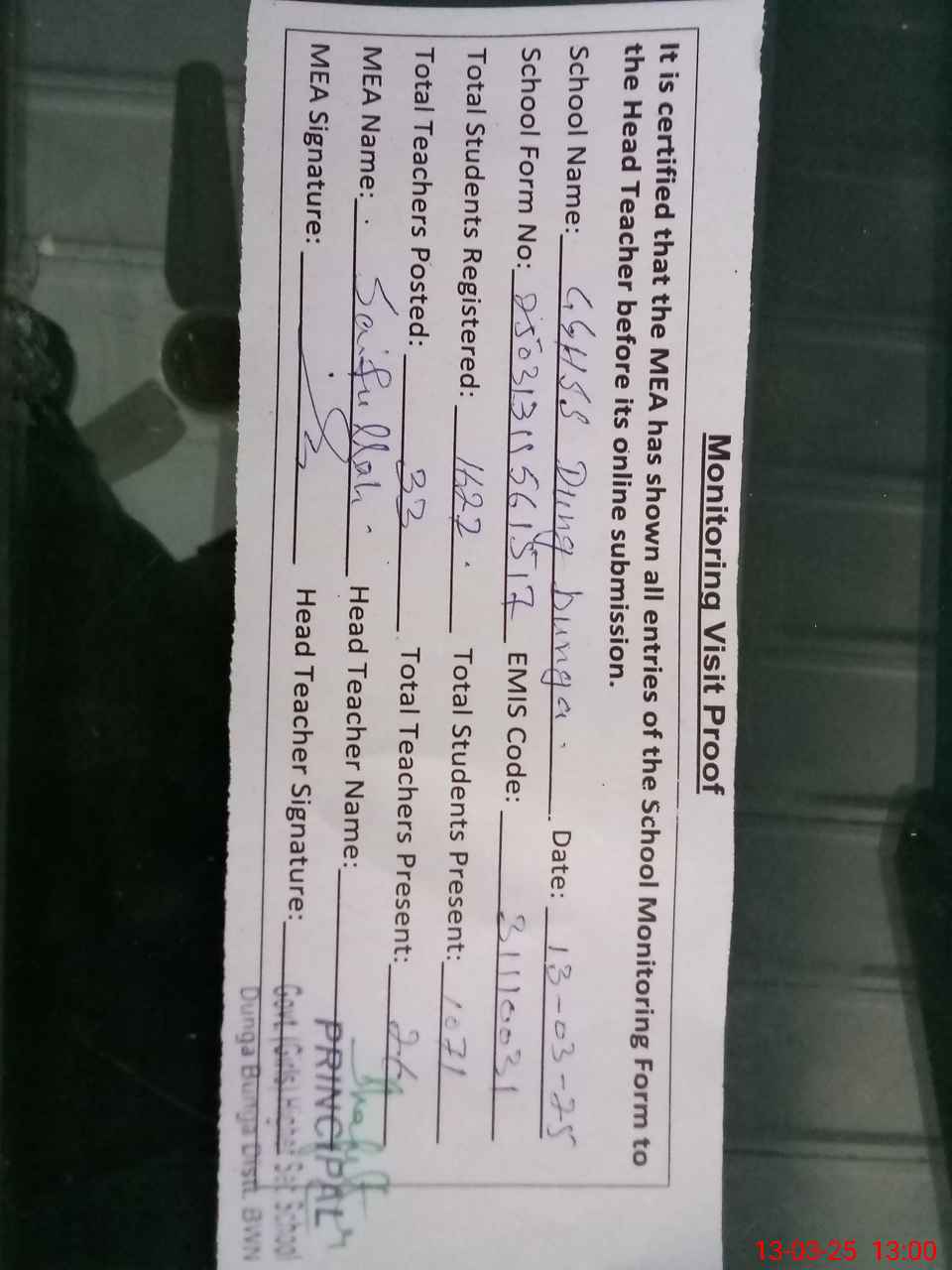 | Attendance Register | Head Teacher | MEA with School | Visit Proof |