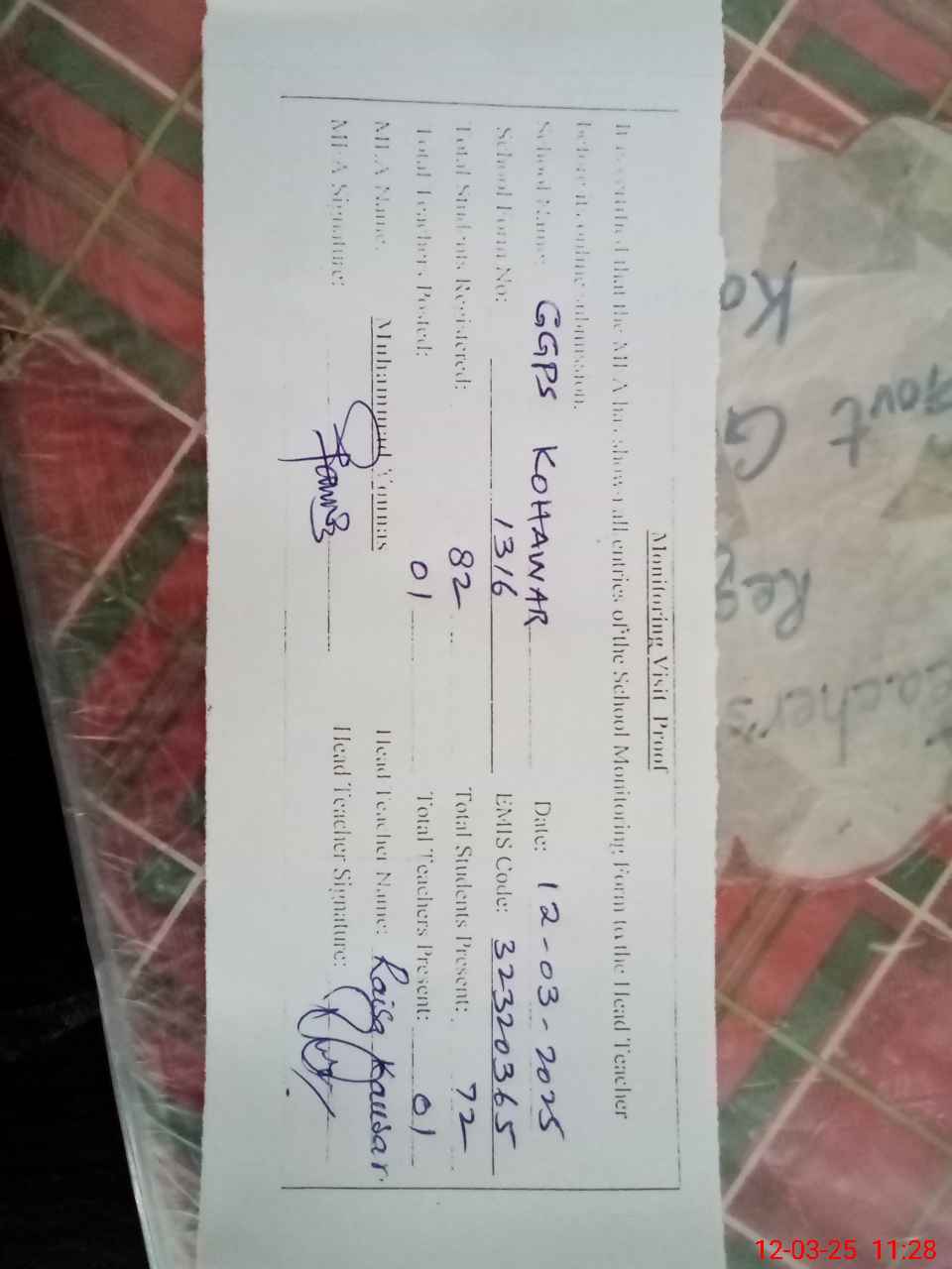 | EMIS Code: 32320365 | Name of School: GGPS KOHAWAR | |||