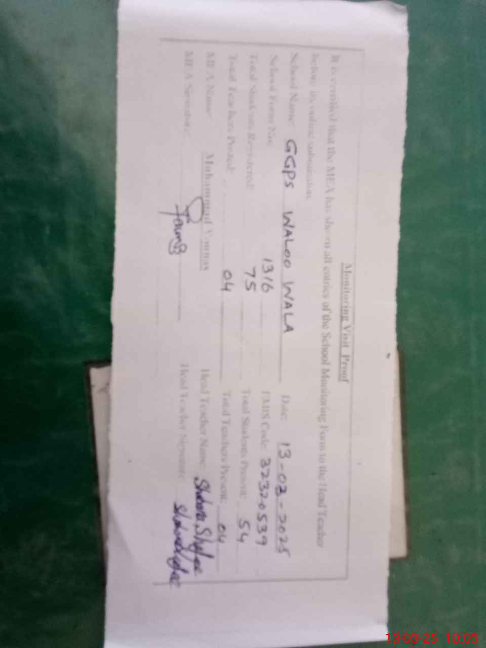 | Attendance Register | Head Teacher | MEA with School | Visit Proof |