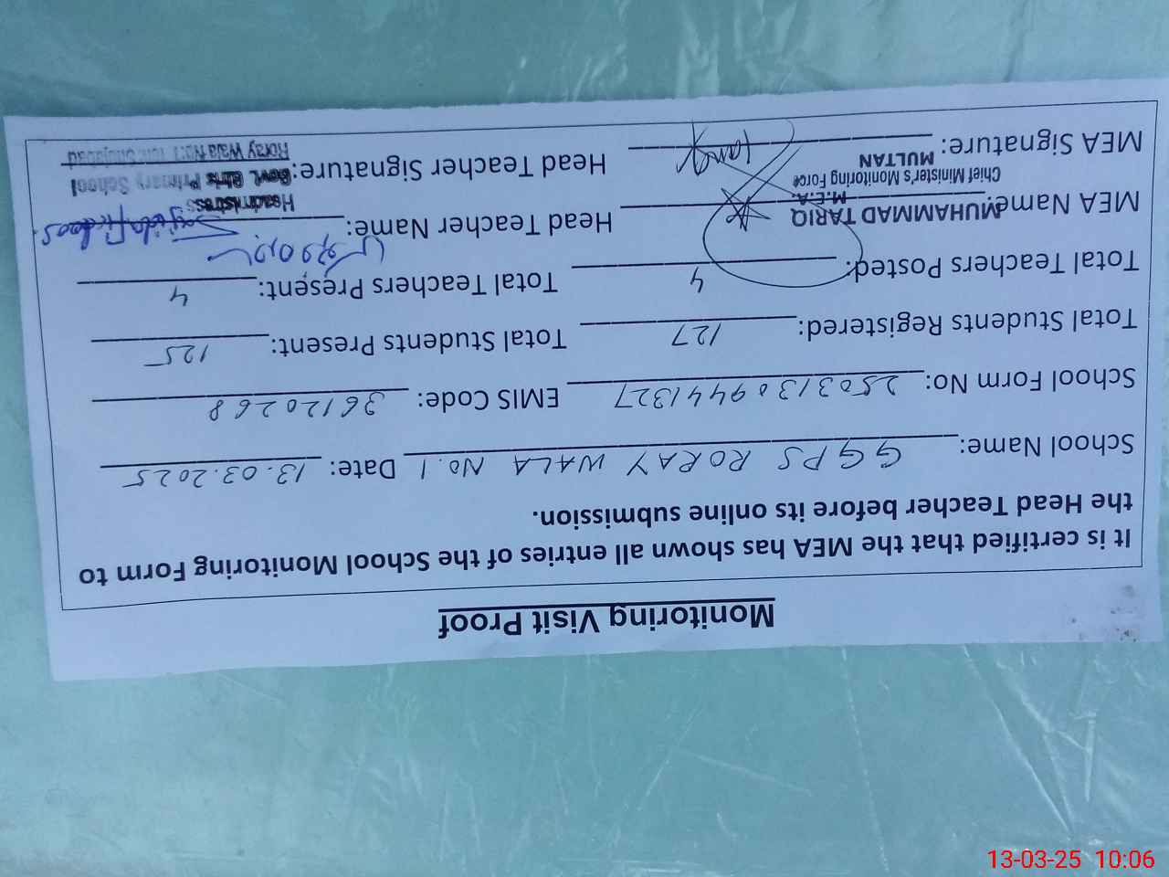 | EMIS Code: 36120268 | Name of School: GGPS RORAY WALA NO.1 SHUJABAD | |||