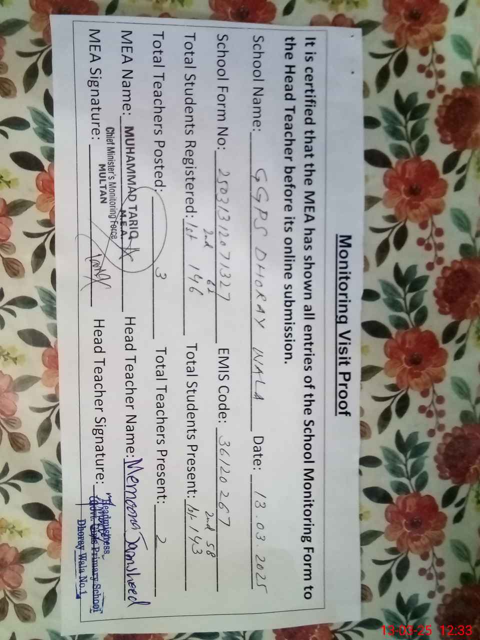 | EMIS Code: 36120267 | Name of School: GGPS DHORAY WALA NO.1 SHUJABAD | |||