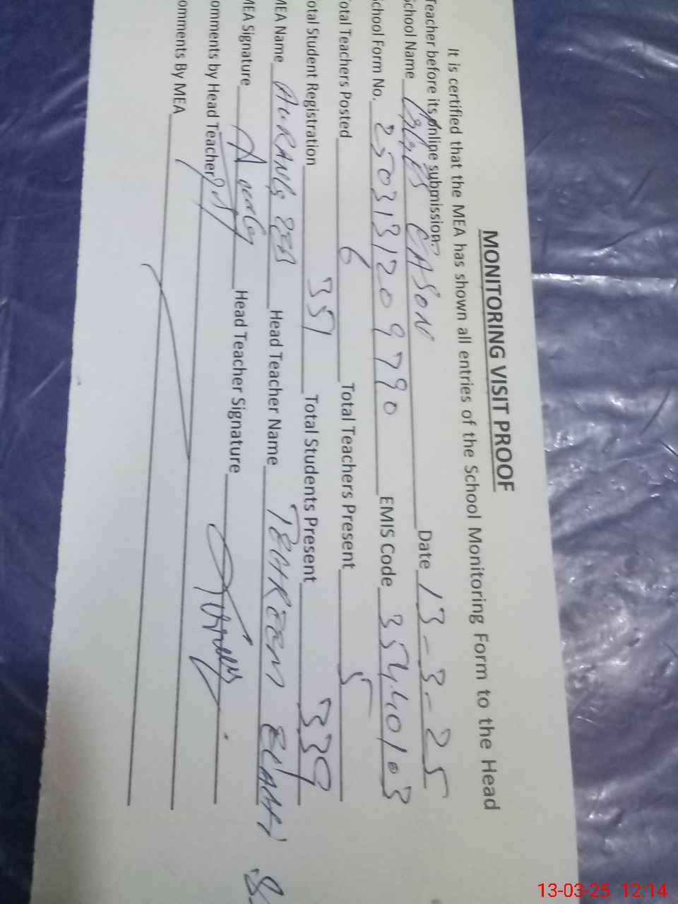 | Attendance Register | Head Teacher | MEA with School | Visit Proof |