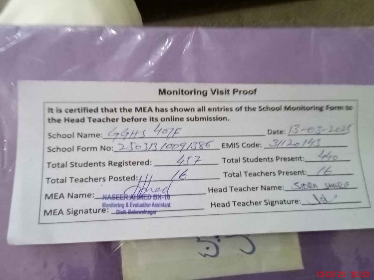 | EMIS Code: 31120143 | Name of School: GGHS CHAK NO. 40/F | |||