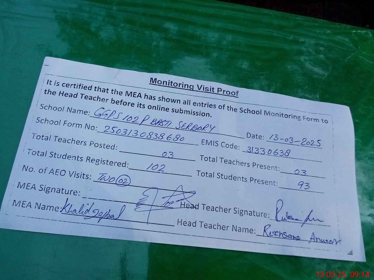 | Attendance Register | Head Teacher | MEA with School | Visit Proof |