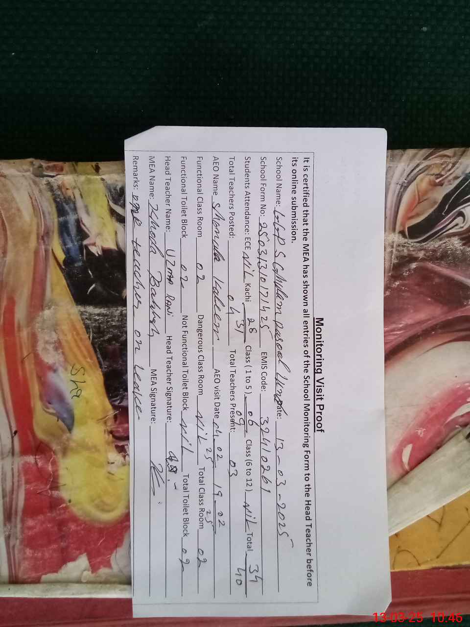| Attendance Register | Head Teacher | MEA with School | Visit Proof |