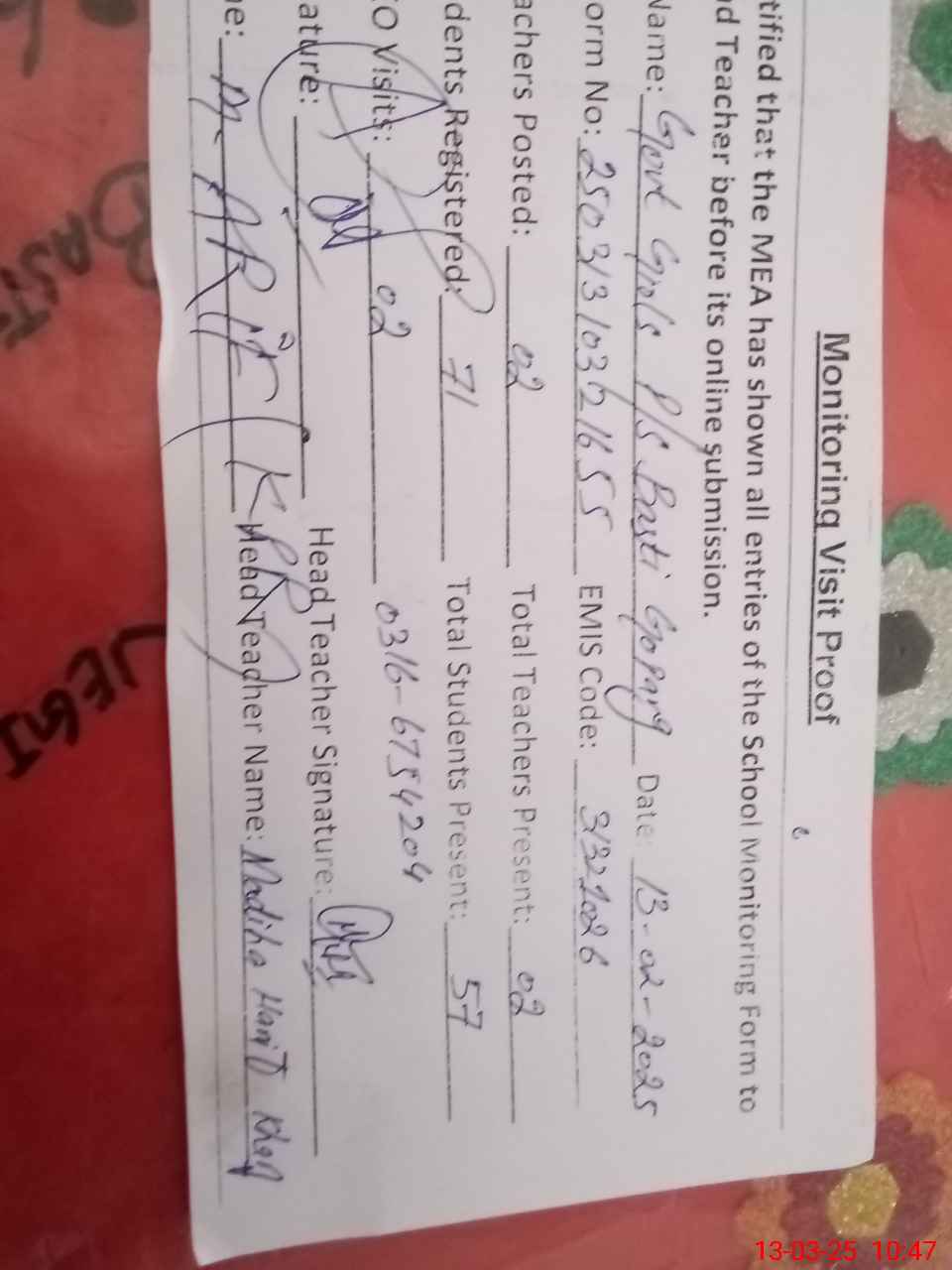 | Name: Ma**** Ha**** Kh**** Designation: (School Headmaster's/Headmistress's) PST Phone/Cell Number: 03**** |
