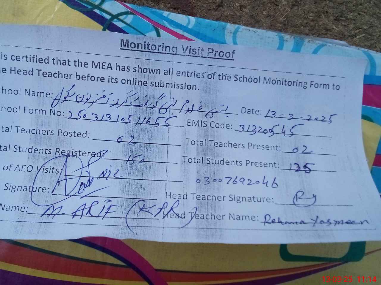 | Attendance Register | Head Teacher | MEA with School | Visit Proof |