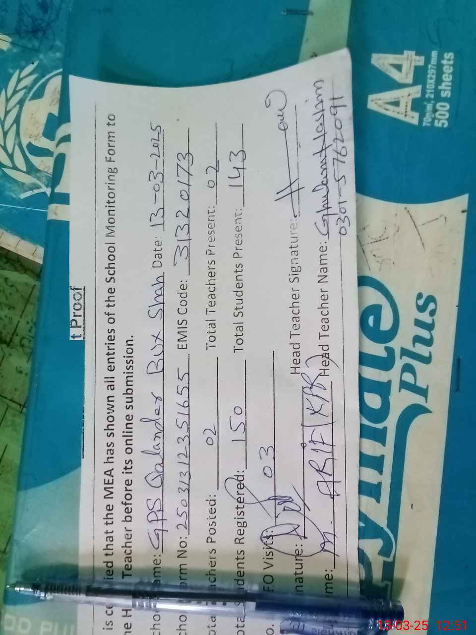 | Name: GH**** HA**** Designation: (School Headmaster's/Headmistress's) PST/PTC/JV Phone/Cell Number: 03**** |