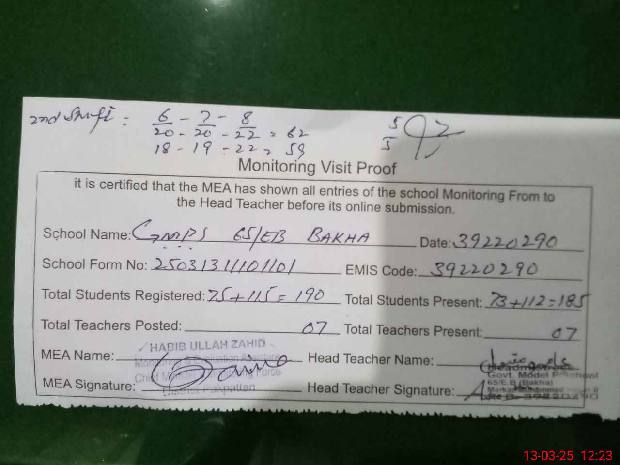 | EMIS Code: 39220290 | Name of School: GMPS 65 EB BAKHA P/O ARIFWALA PAKPATTAN | |||