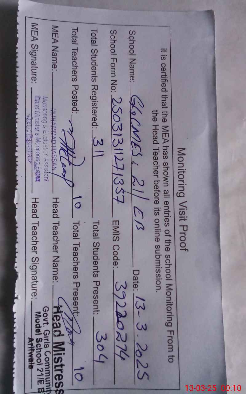 | Certified that this School was Inspected by the Undersigned MEA/DMO Today and the Information Stated Above is as Per Record. | |||||