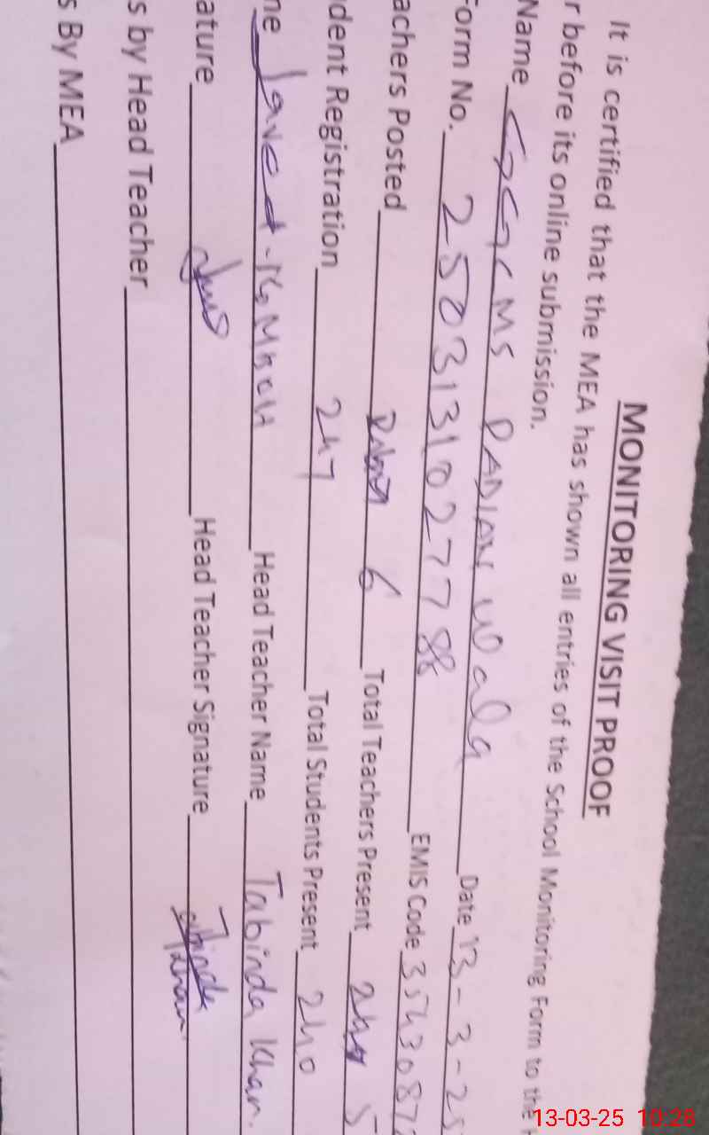 | Certified that this School was Inspected by the Undersigned MEA/DMO Today and the Information Stated Above is as Per Record. | |||||