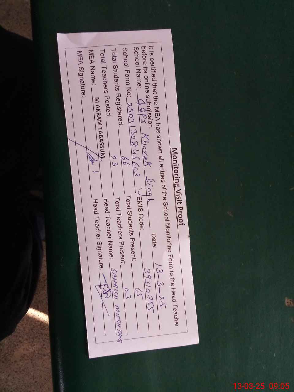 | Attendance Register | Head Teacher | MEA with School | Visit Proof |