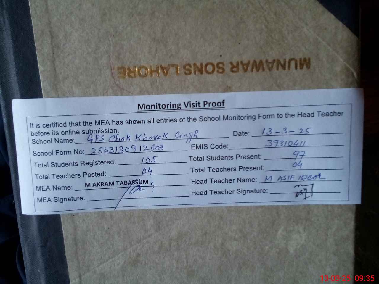 | Attendance Register | Head Teacher | MEA with School | Visit Proof |