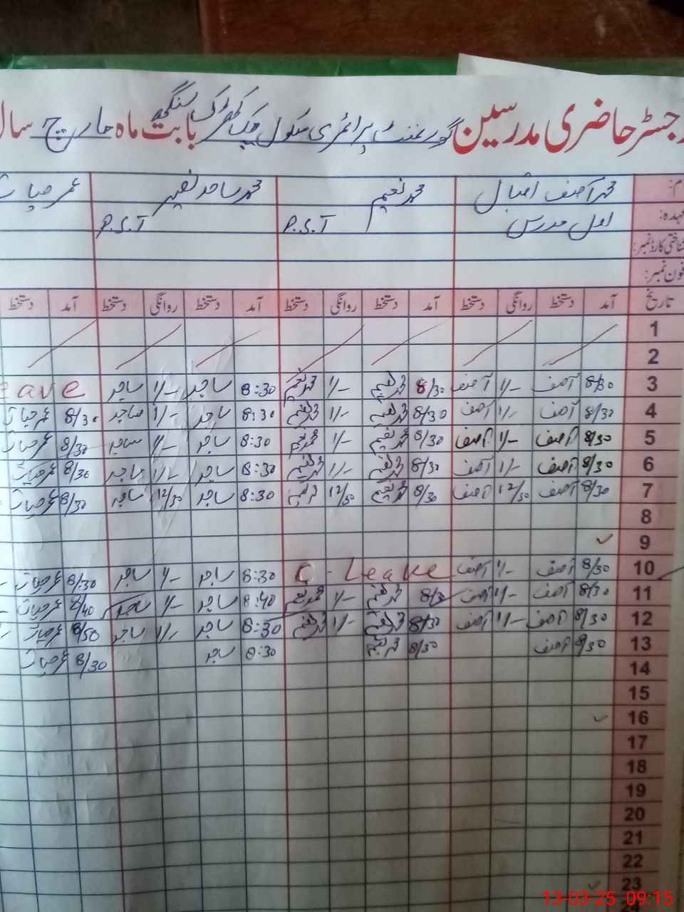 | CNIC | Full Name | Designation | R/C | Absence During Last Calender Month |