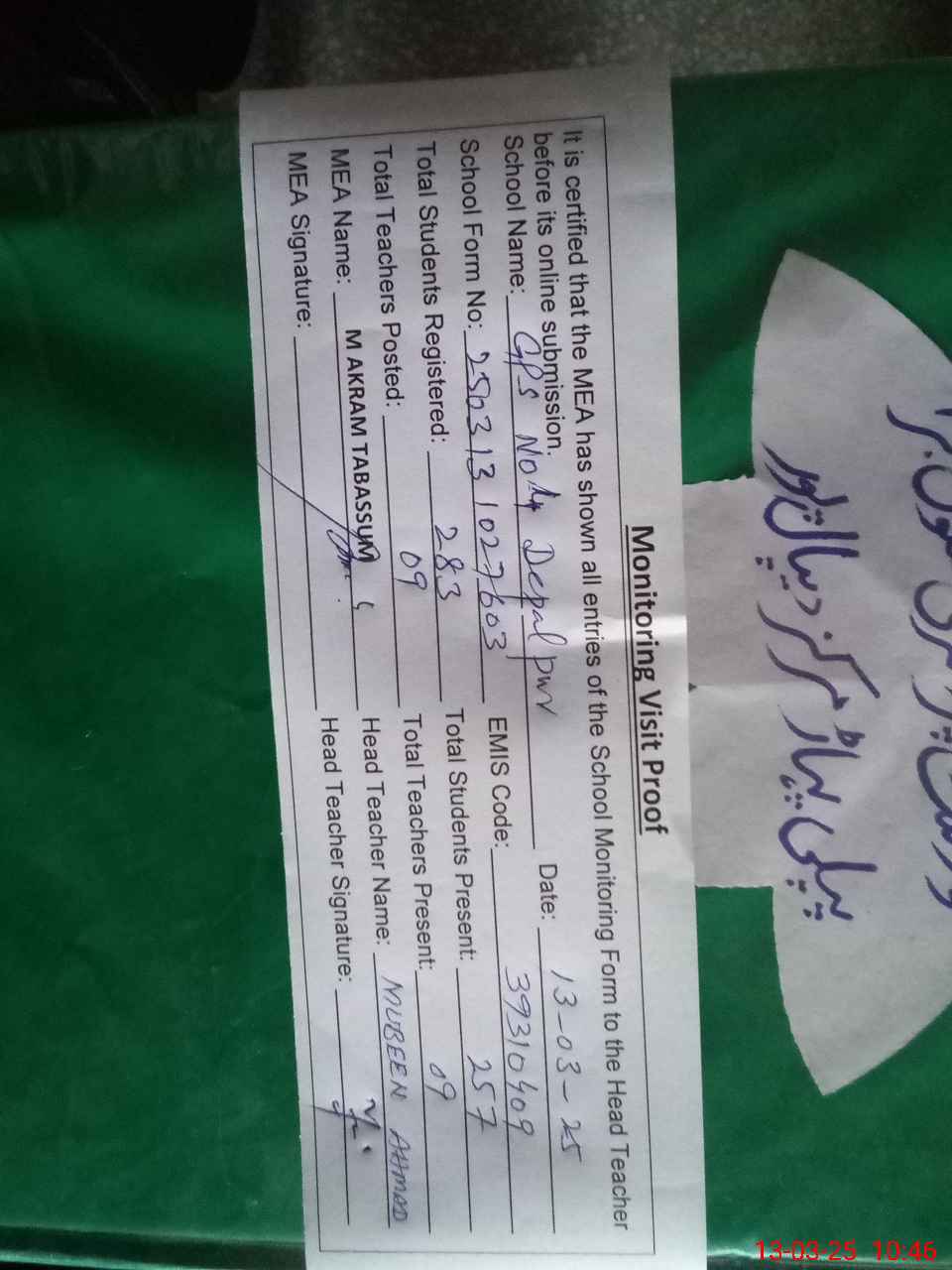 | EMIS Code: 39310409 | Name of School: GPS NO.4 DEPALPUR | |||