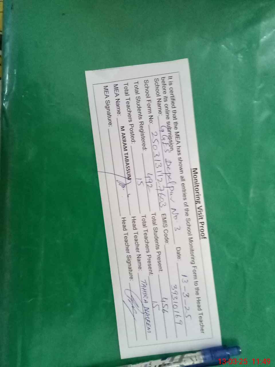 | Attendance Register | Head Teacher | MEA with School | Visit Proof |