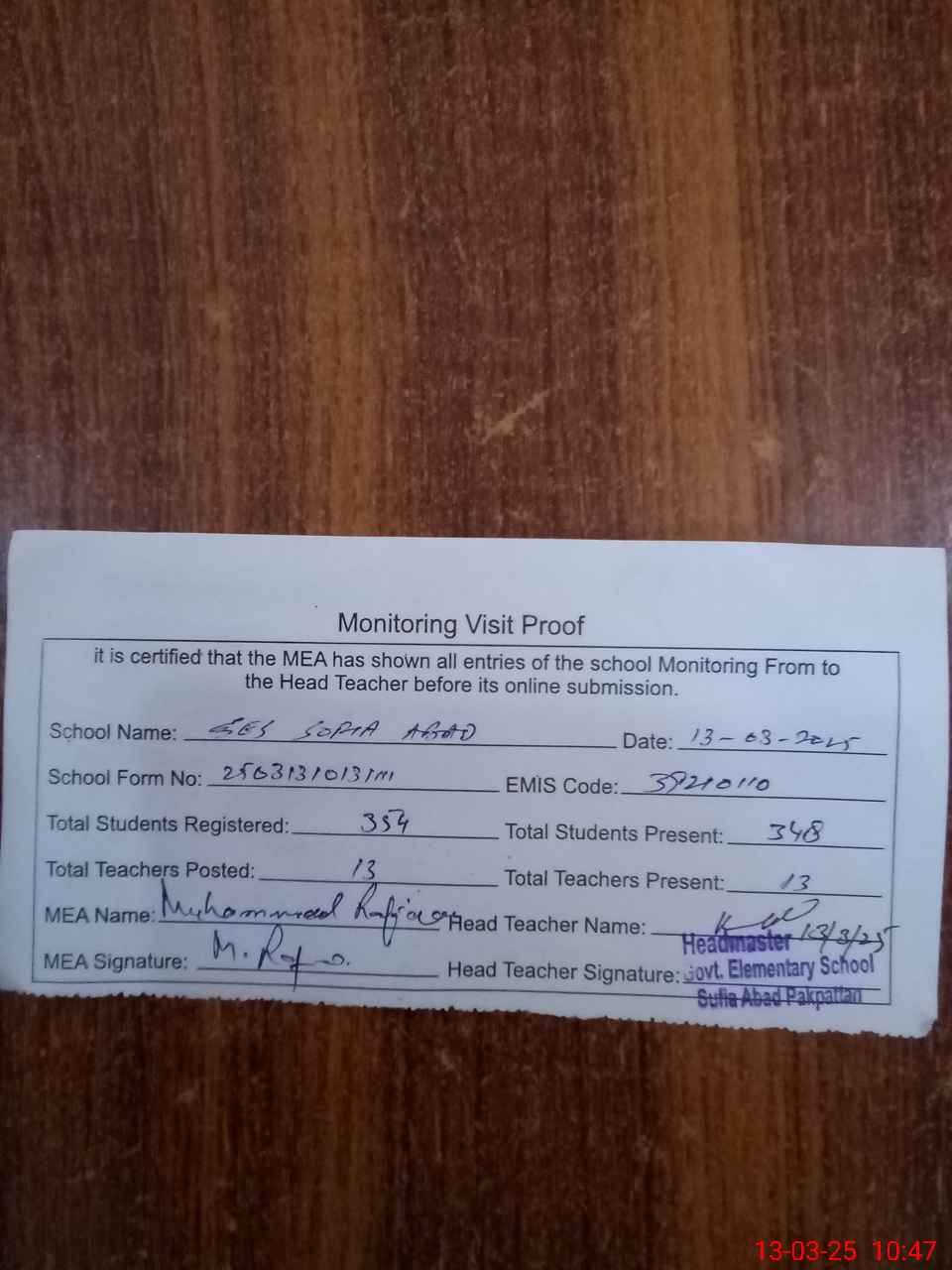 | Certified that this School was Inspected by the Undersigned MEA/DMO Today and the Information Stated Above is as Per Record. | |||||