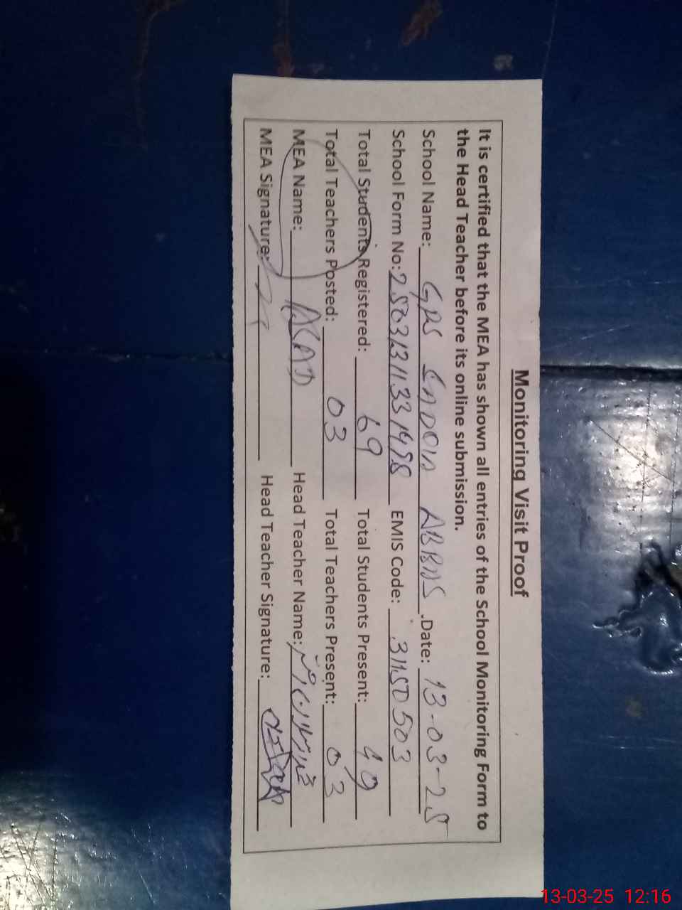 | Attendance Register | Head Teacher | MEA with School | Visit Proof |