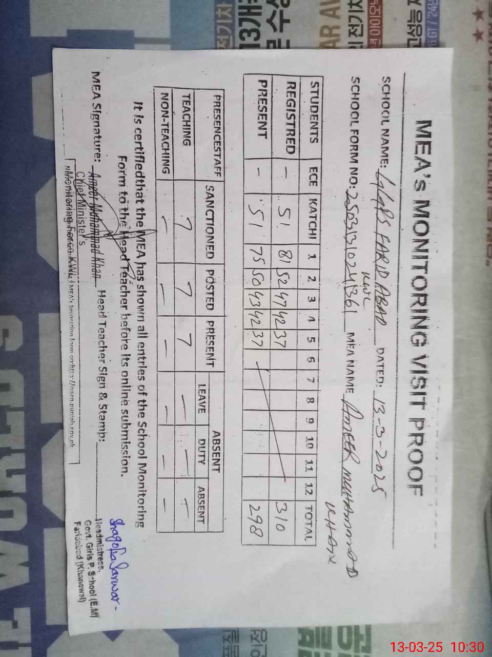 | Attendance Register | Head Teacher | MEA with School | Visit Proof |