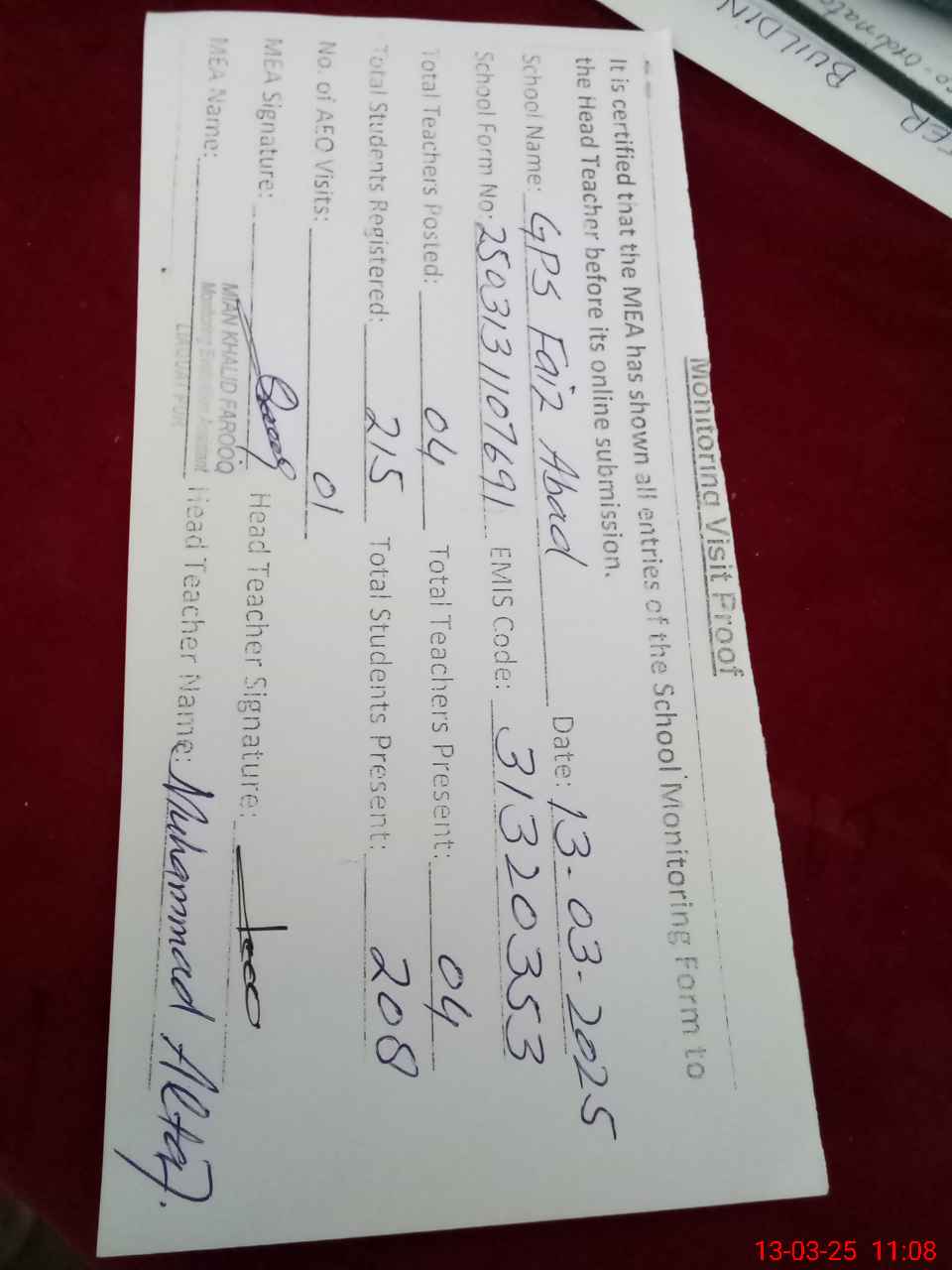 | Attendance Register | Head Teacher | MEA with School | Visit Proof |