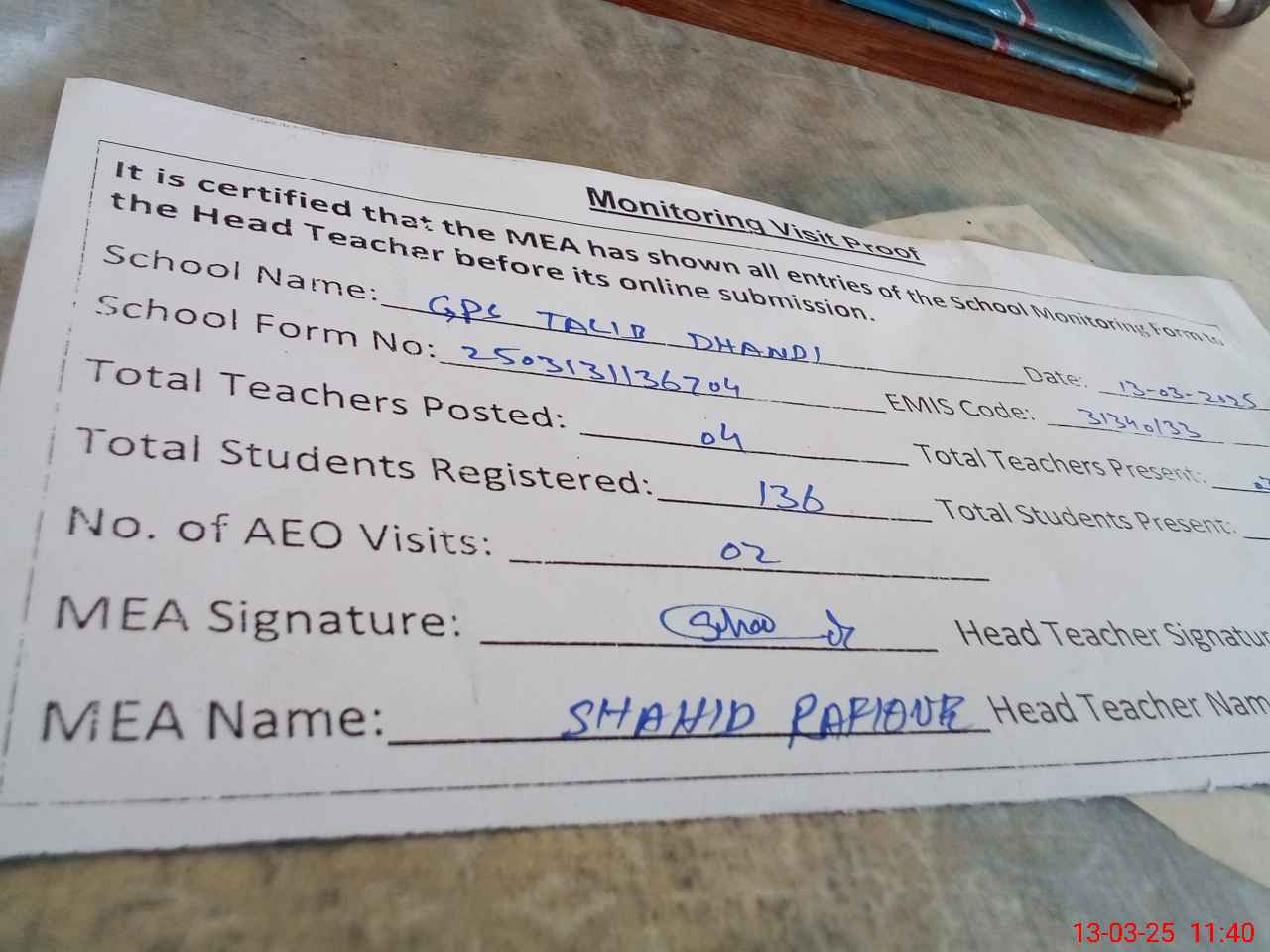 | EMIS Code: 31340133 | Name of School: GPS TALIB DHANDI | |||