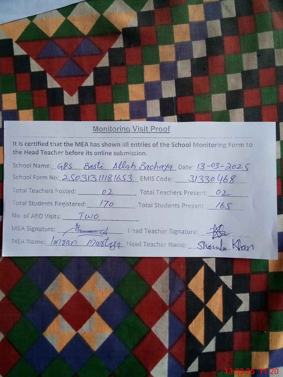 | EMIS Code: 31330468 | Name of School: GPS BASTI ALLAH BACHAYA | |||