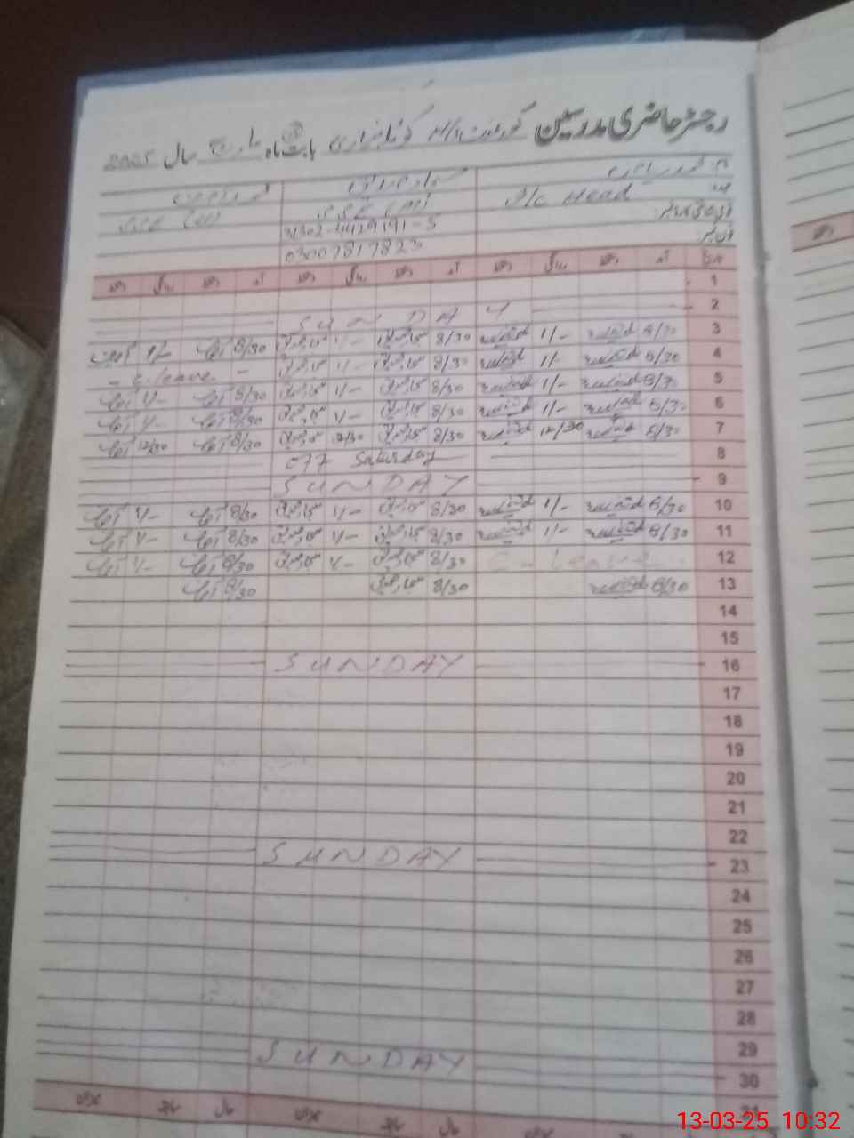 | Name: MU**** RI**** Designation: (School Headmaster's/Headmistress's) SST (BIO CHEM)) Phone/Cell Number: 03**** |