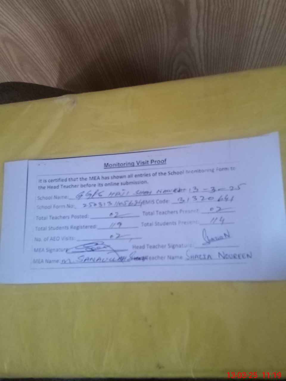 | Attendance Register | Head Teacher | MEA with School | Visit Proof |