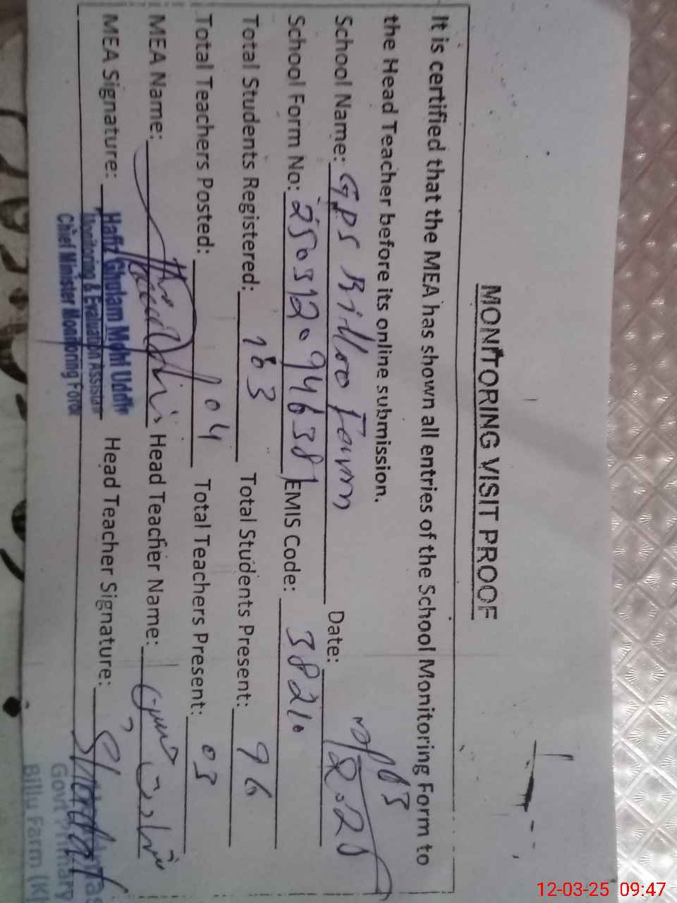 | Attendance Register | Head Teacher | MEA with School | Visit Proof |