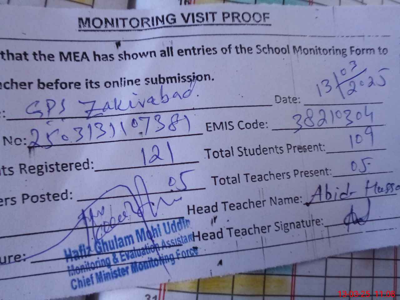 | EMIS Code: 38210304 | Name of School: GPS ZAKIR ABAD | |||