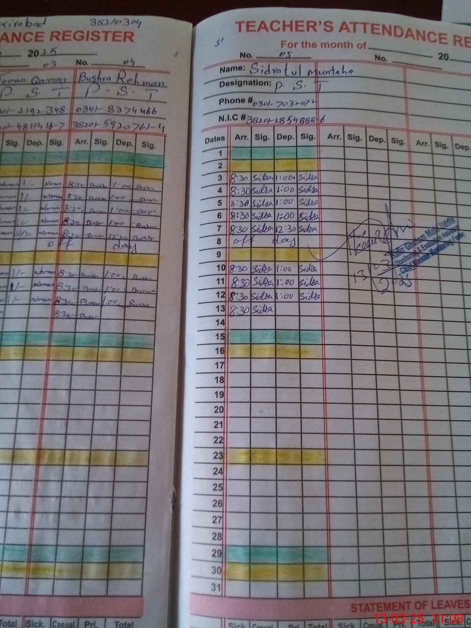 | CNIC | Full Name | Designation | R/C | Absence During Last Calender Month |