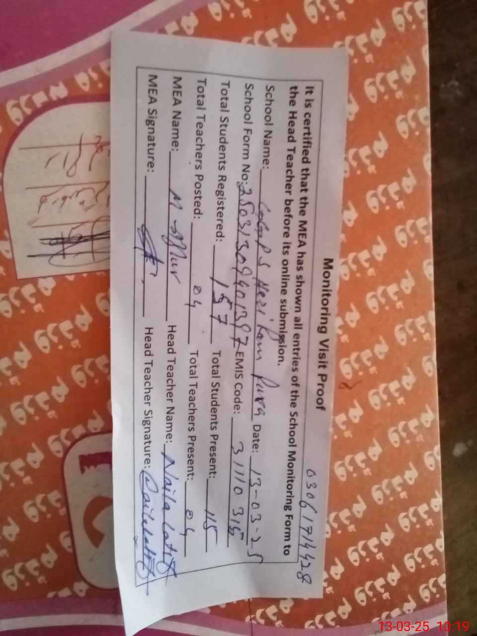 | Attendance Register | Head Teacher | MEA with School | Visit Proof |