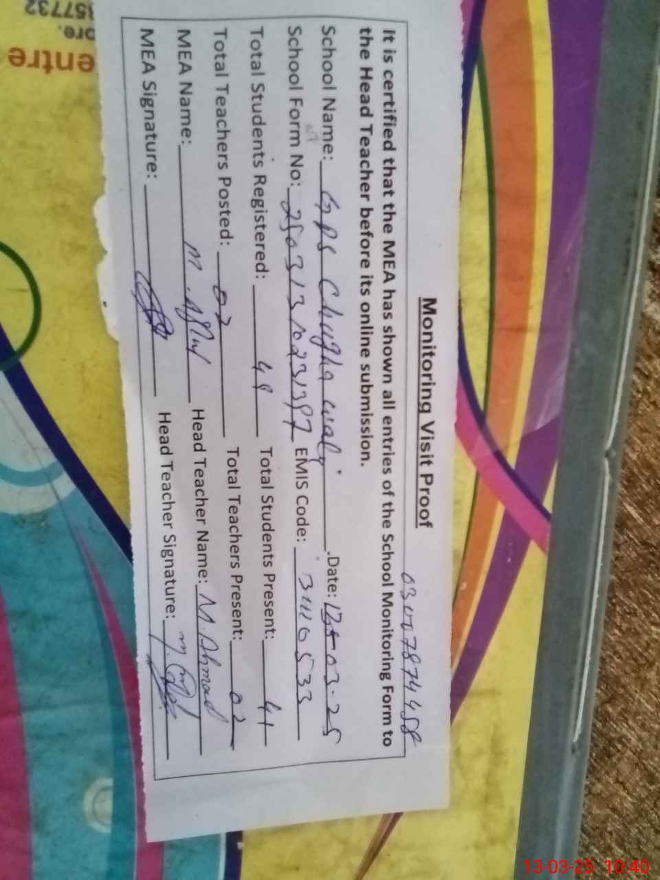 | Attendance Register | Head Teacher | MEA with School | Visit Proof |