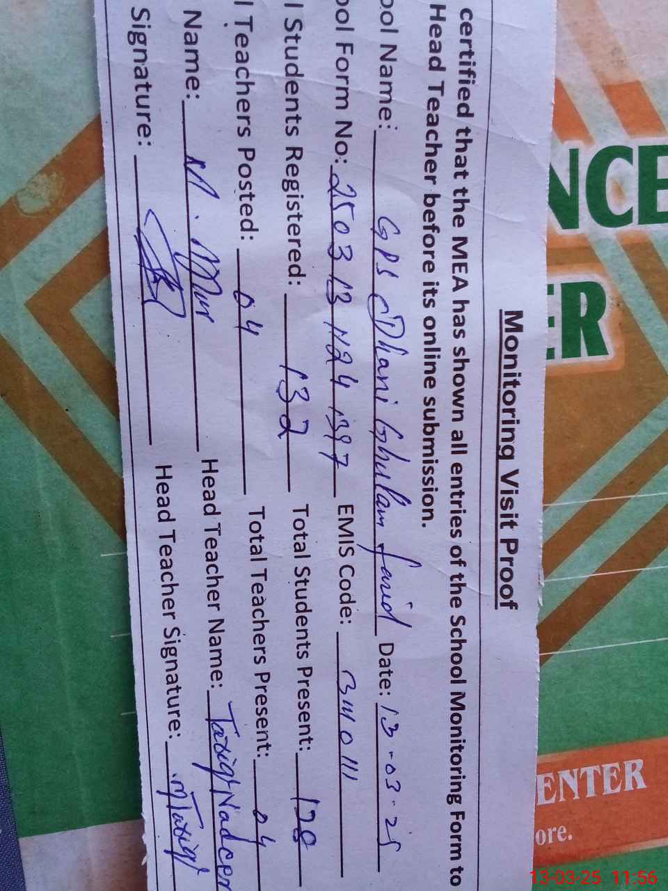 | EMIS Code: 31110111 | Name of School: GPS DHANI GHULAM FAREED | |||