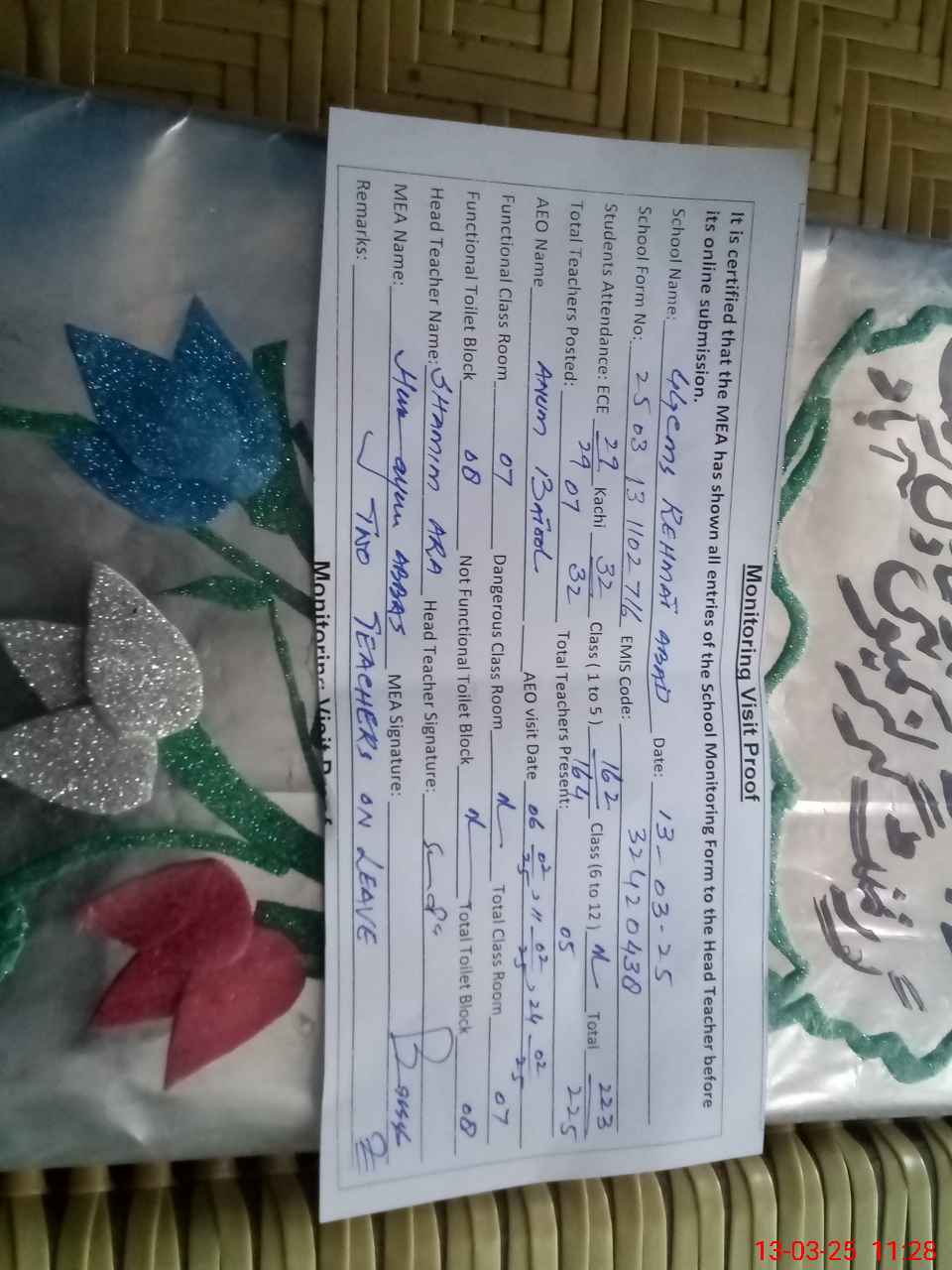 | Remarks (Use Separate Page if Required): One teacher on casual leave One teacher on medical leave over All cleaness good | |||||