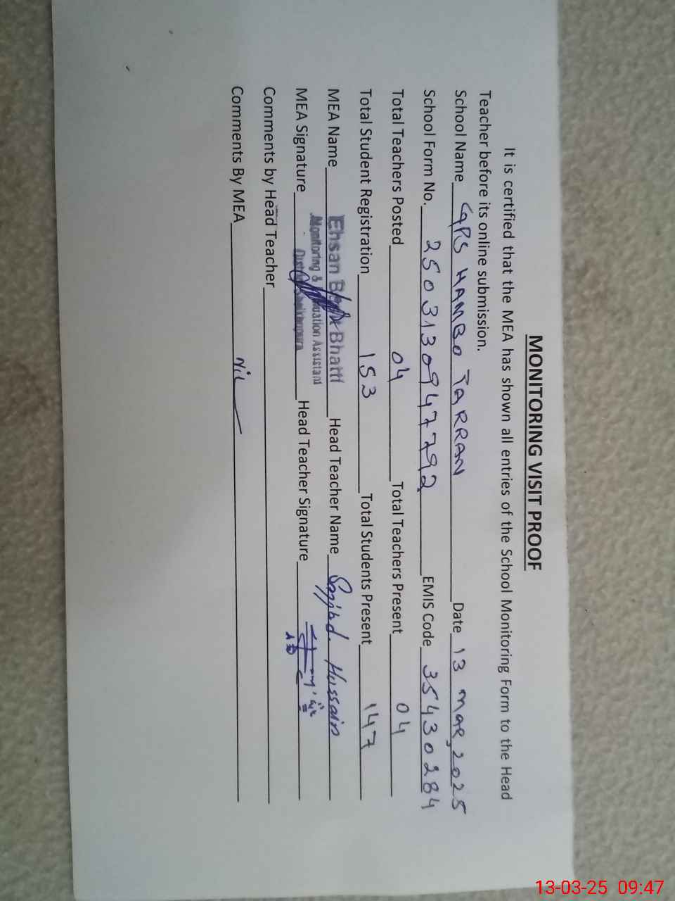 | Attendance Register | Head Teacher | MEA with School | Visit Proof |
