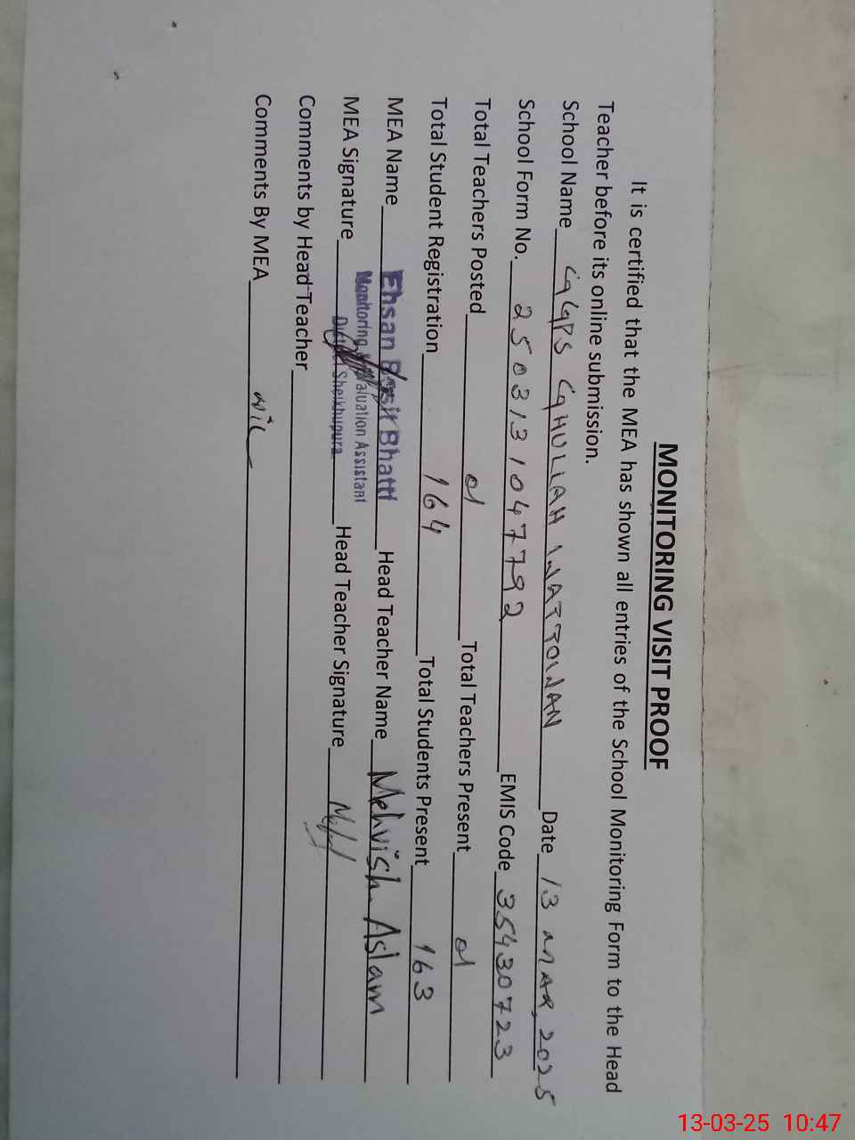 | Attendance Register | Head Teacher | MEA with School | Visit Proof |