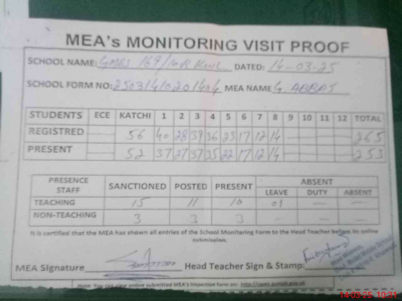 | Attendance Register | Head Teacher | MEA with School | Visit Proof |