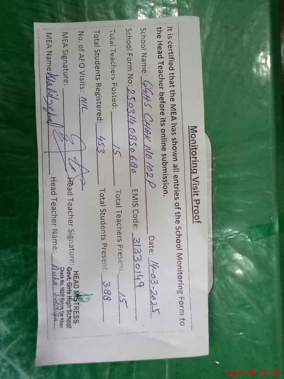 | EMIS Code: 31330149 | Name of School: GGHS CHAK NO. 102/P | |||