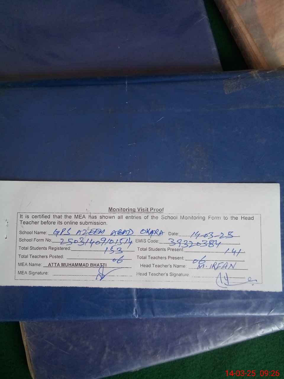 | Attendance Register | Head Teacher | MEA with School | Visit Proof |