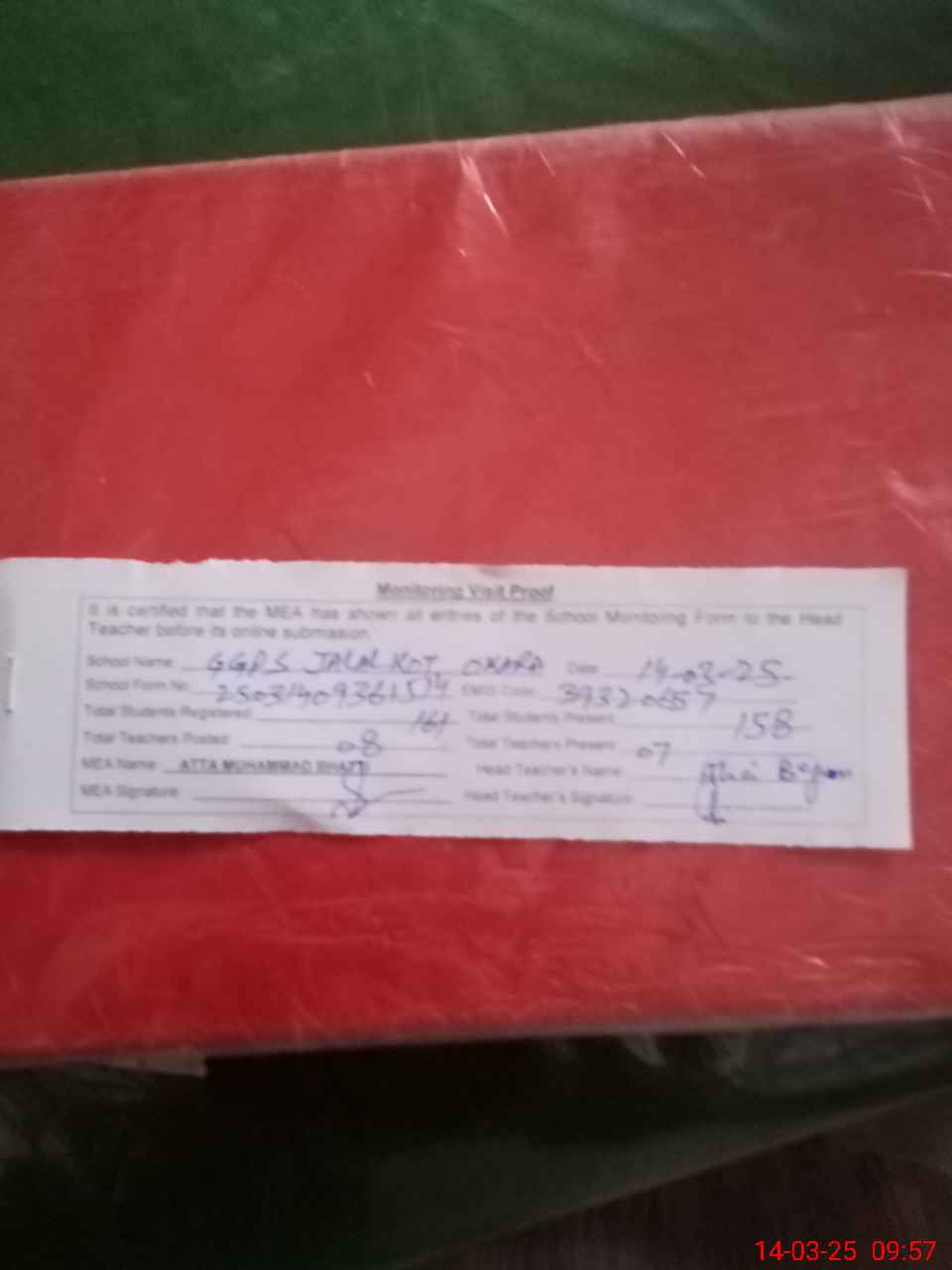 | Attendance Register | Head Teacher | MEA with School | Visit Proof |