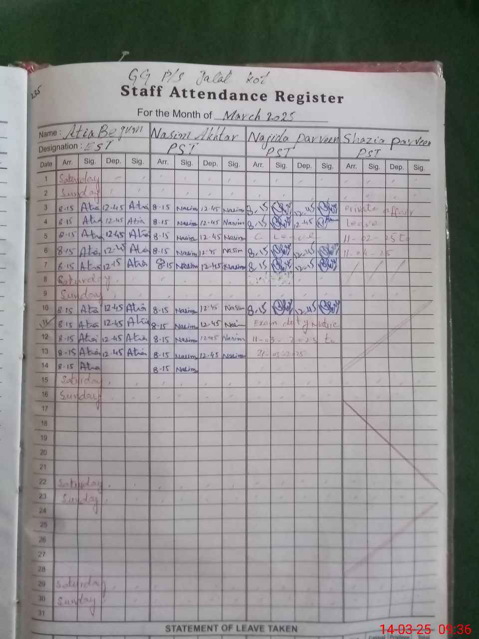 | 35**** | Na**** Pe**** | PST | Regular | 2 | 0 | 0 | 0 | 0 | 0 | 0 | 0 | 2 | Exam Duty |
